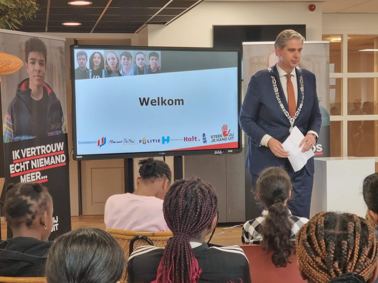 Vandaag hadden we burgemeester Kolff op bezoek! Hij kwam om het platform ‘Steek jij je hand uit’ te lanceren. ‘Steek jij je hand uit’ is een digitaal platform om het onderwerp uitbuiting bespreekbaar te maken op scholen. Dit doen we in samenwerking met de gemeente Dordrecht, Politie, Humanitas DMH, Bureau Halt en R-Newt. Het doel van dit platform is het voorkomen en verminderen van criminele, seksuele en arbeidsuitbuiting onder jongeren.